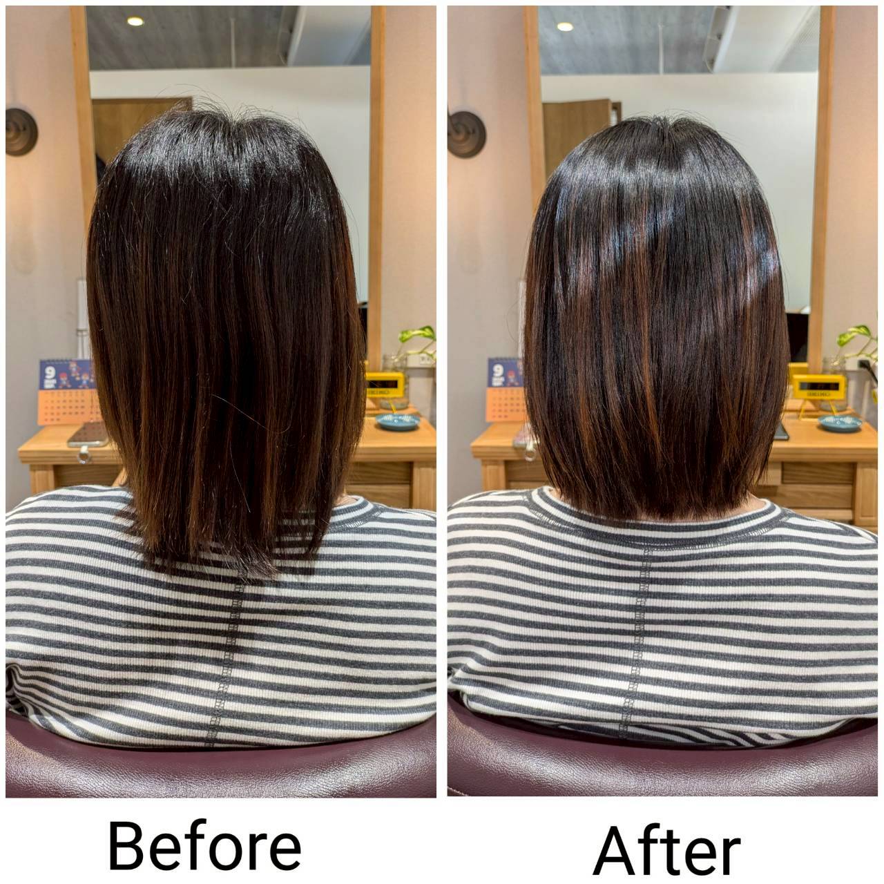 それによって、お客様のお悩みだった、うねりで広がる髪がツヤツヤな艶髪になりました。
